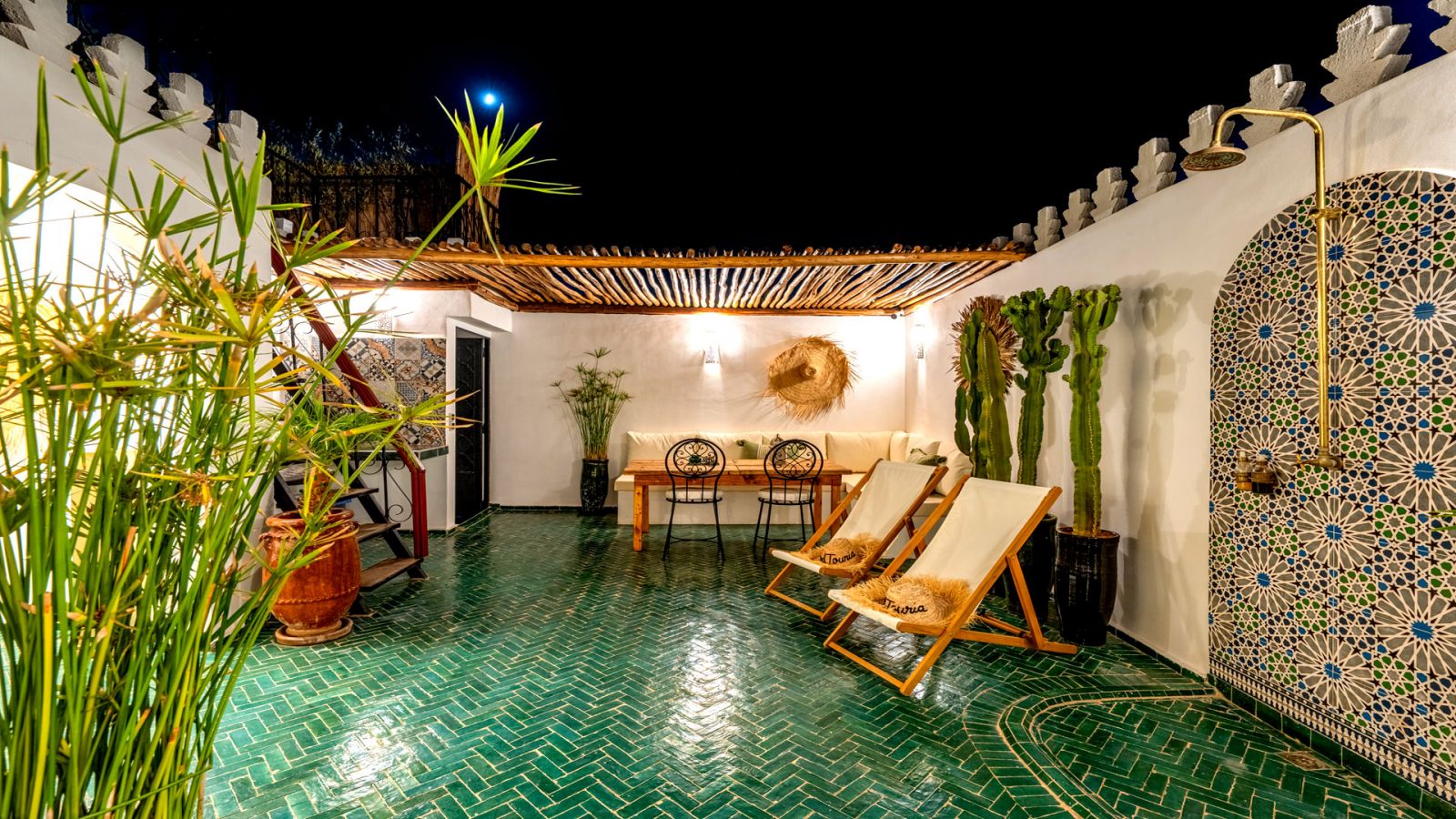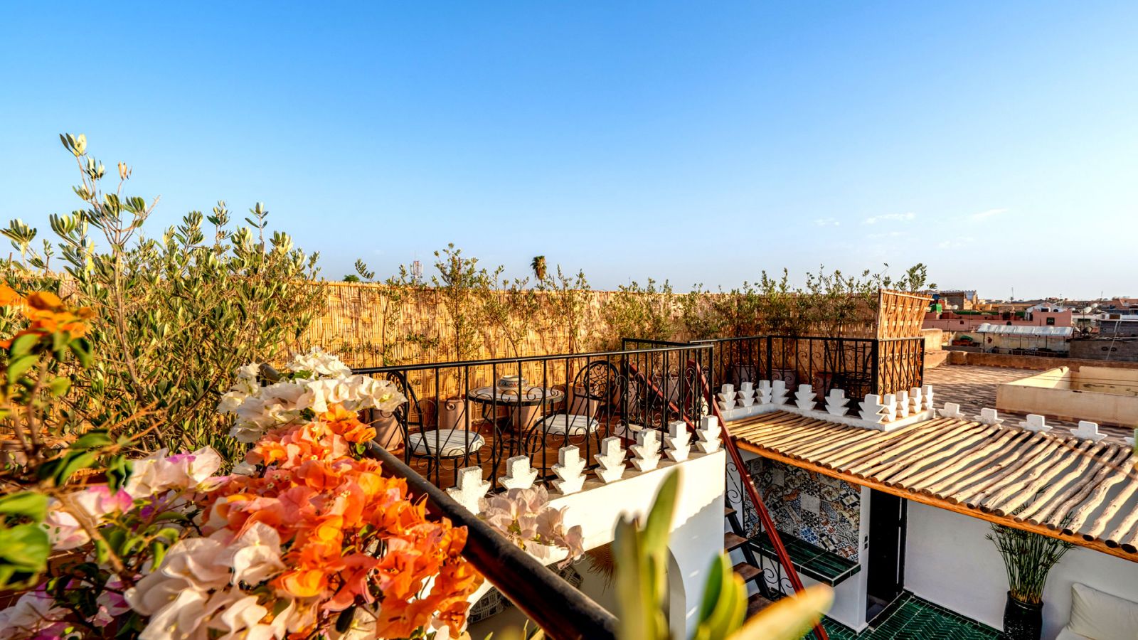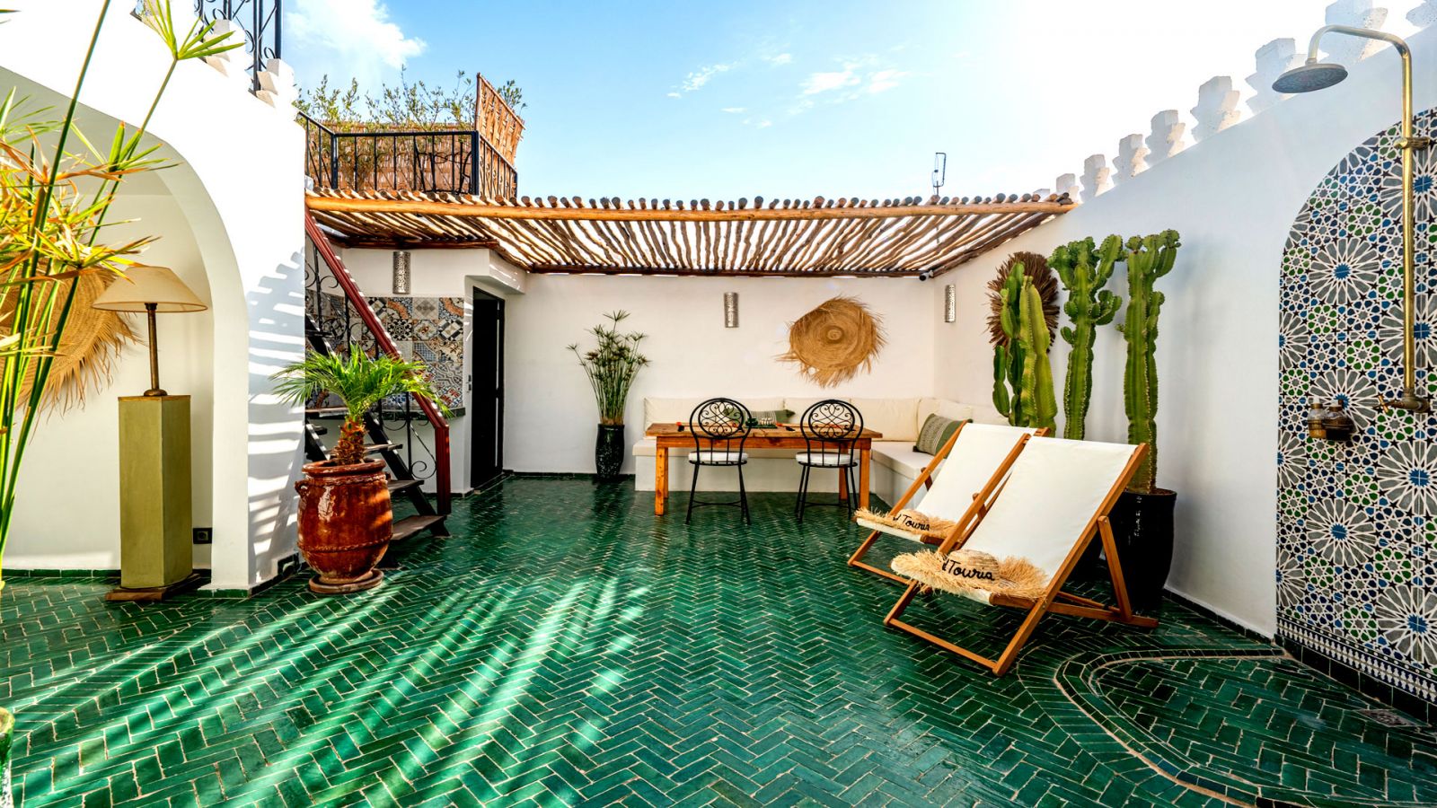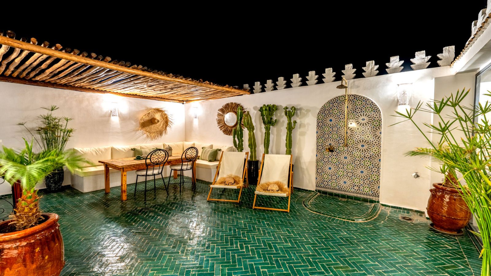 Les terrasses du Riad Touria dominent les toits de la médina comme un refuge suspendu, où la lumière de Marrakech se fait plus douce. Entre coins ombragés, transats et douche rafraîchissante, chaque espace invite au repos et à la contemplation.