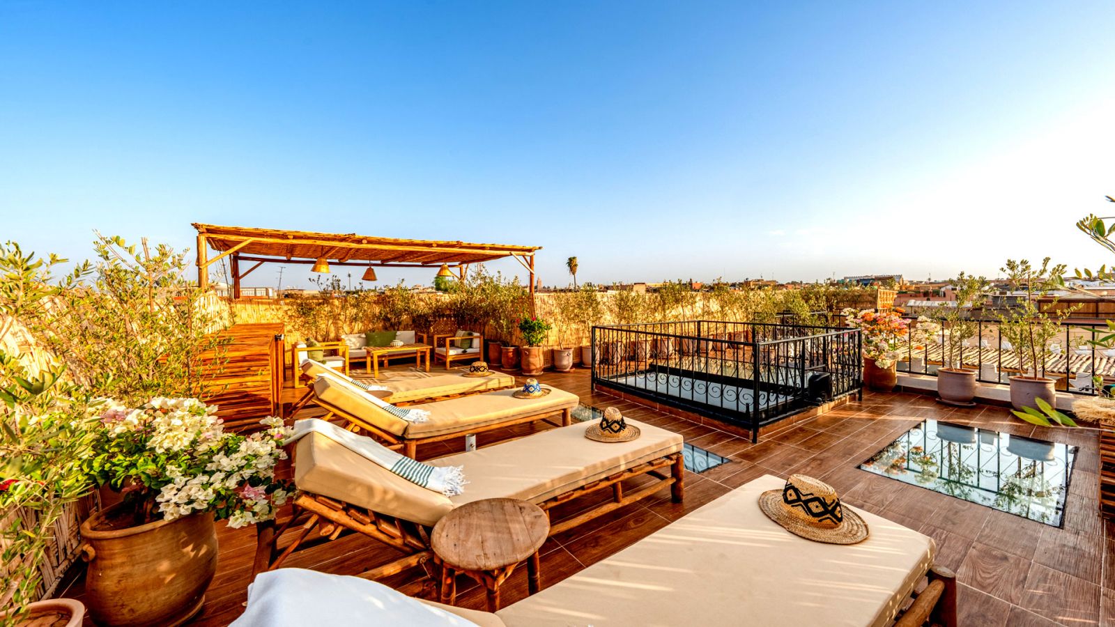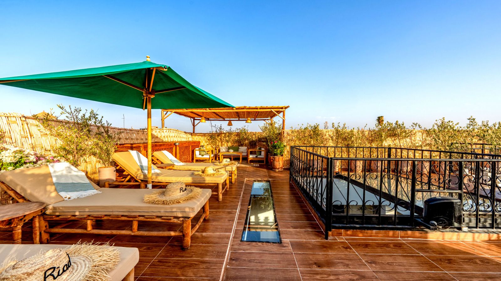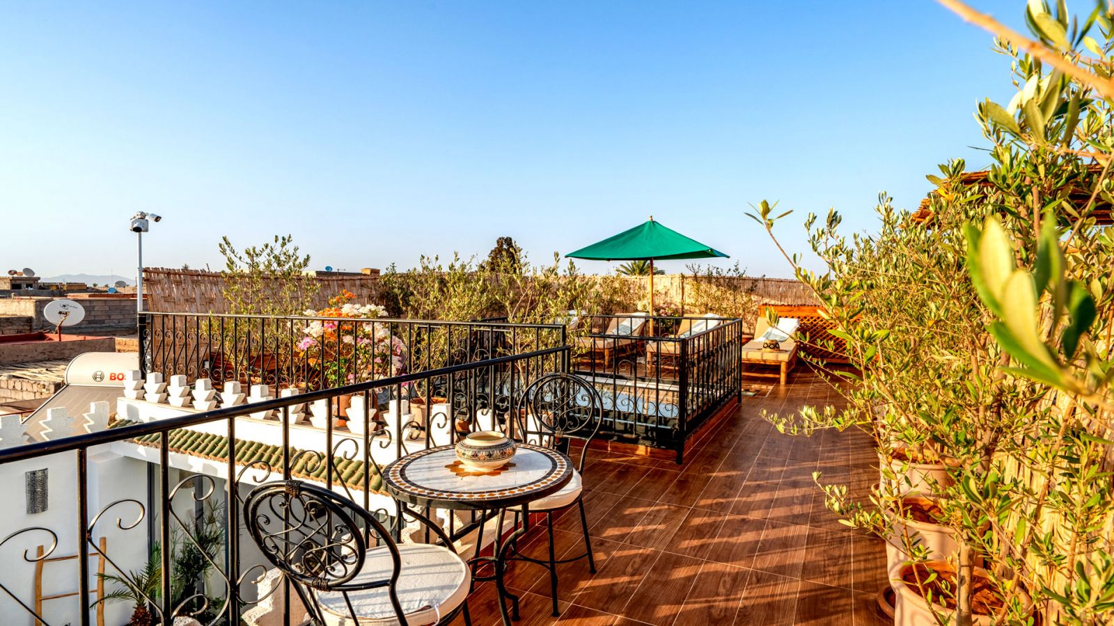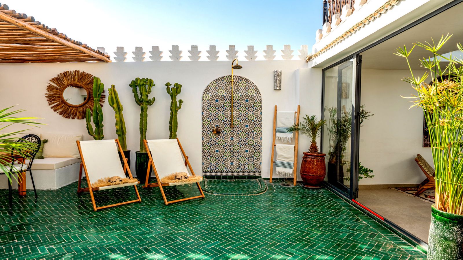 Les terrasses du Riad Touria dominent les toits de la médina comme un refuge suspendu, où la lumière de Marrakech se fait plus douce. Entre coins ombragés, transats et douche rafraîchissante, chaque espace invite au repos et à la contemplation.