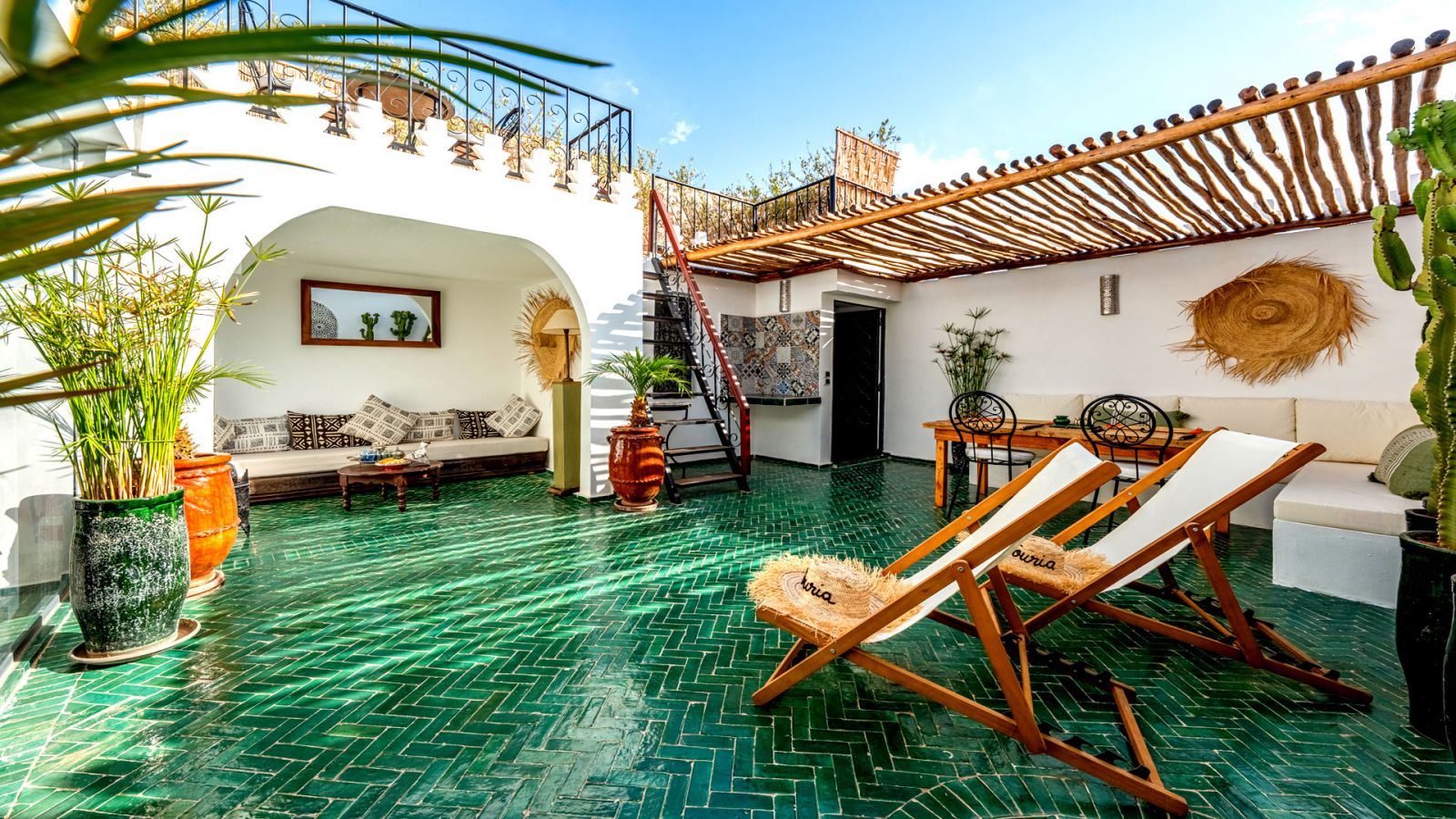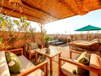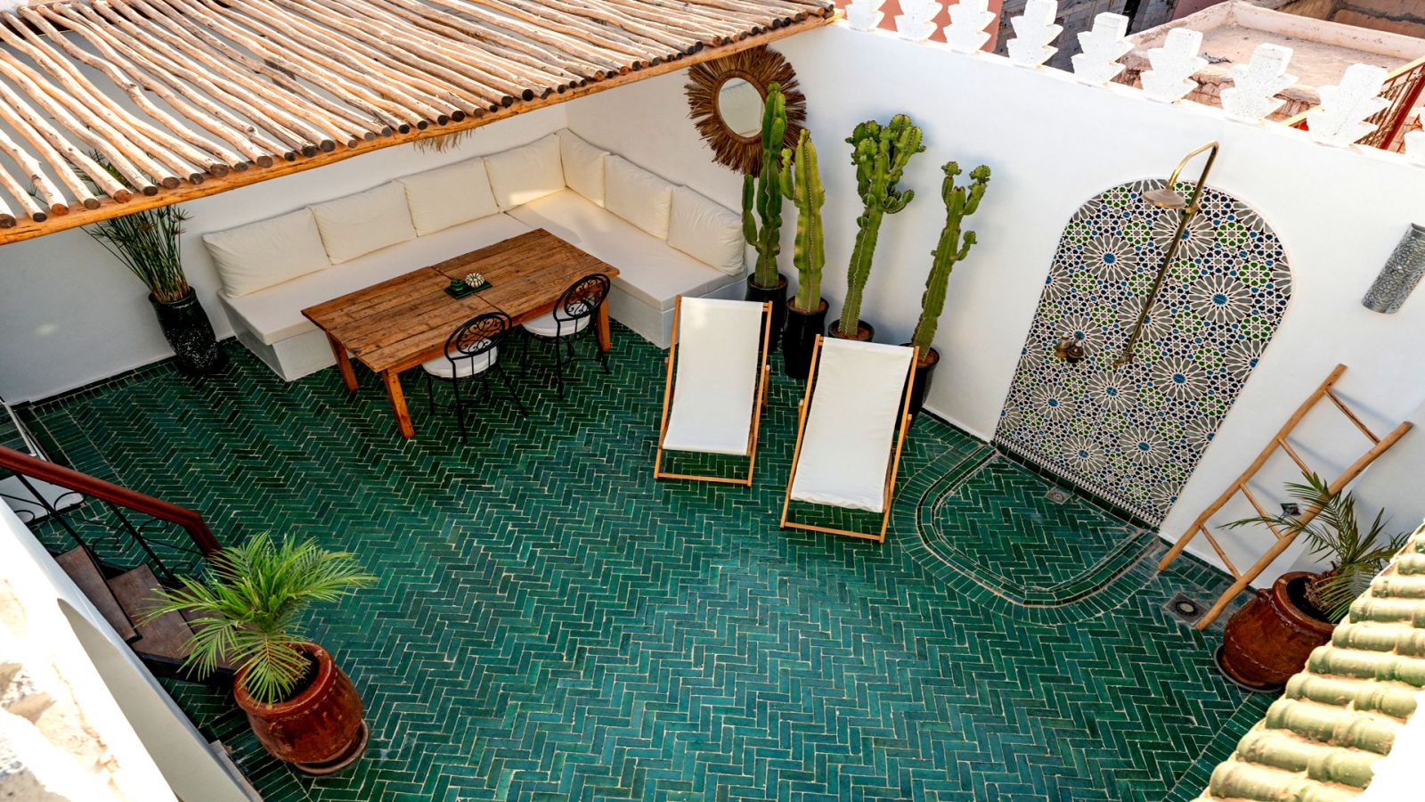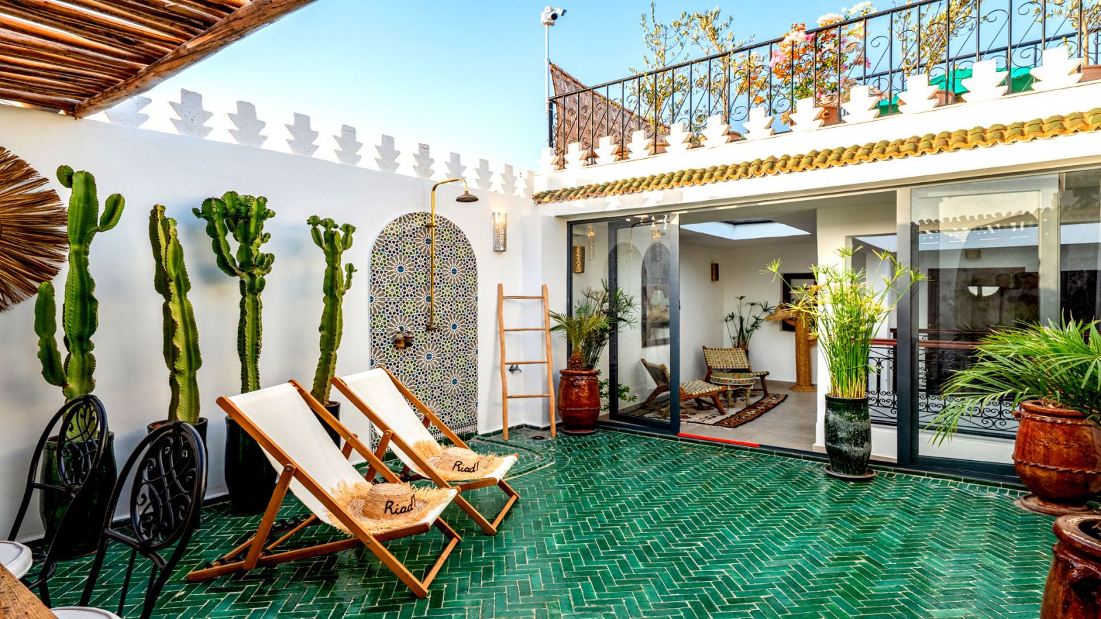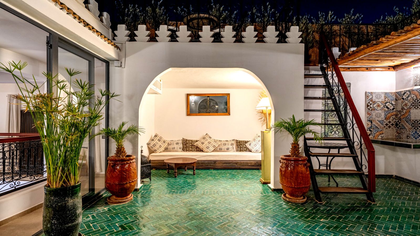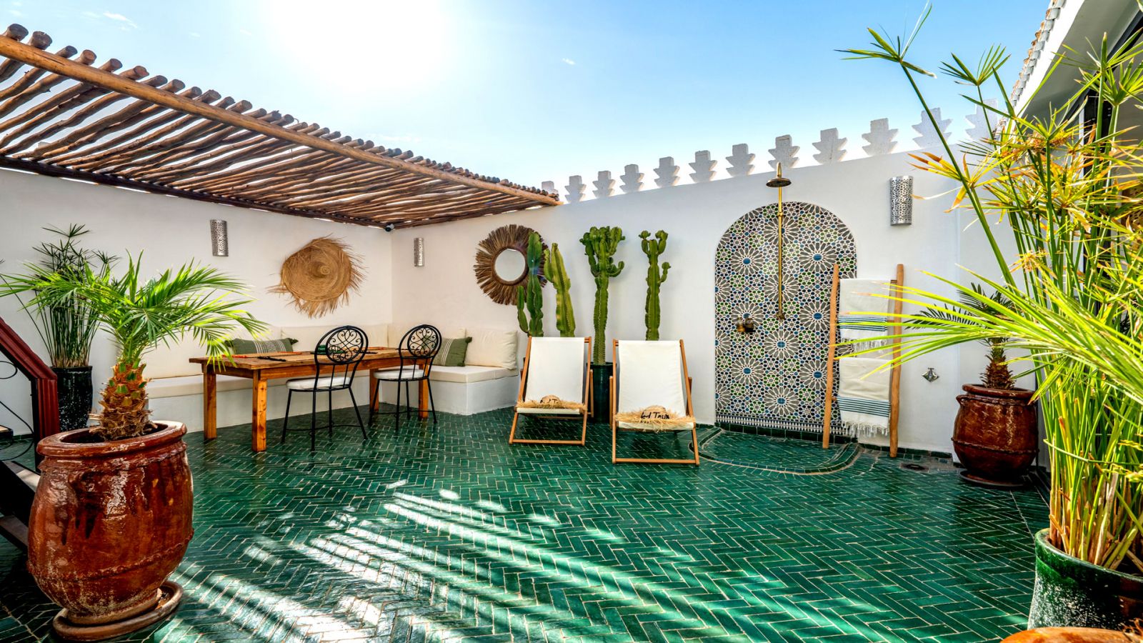 Les terrasses du Riad Touria dominent les toits de la médina comme un refuge suspendu, où la lumière de Marrakech se fait plus douce. Entre coins ombragés, transats et douche rafraîchissante, chaque espace invite au repos et à la contemplation.