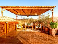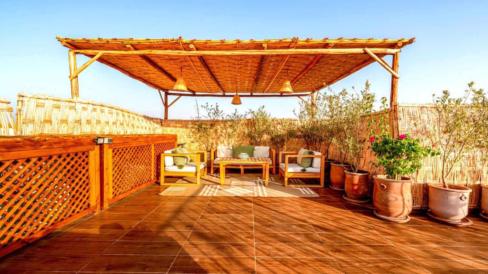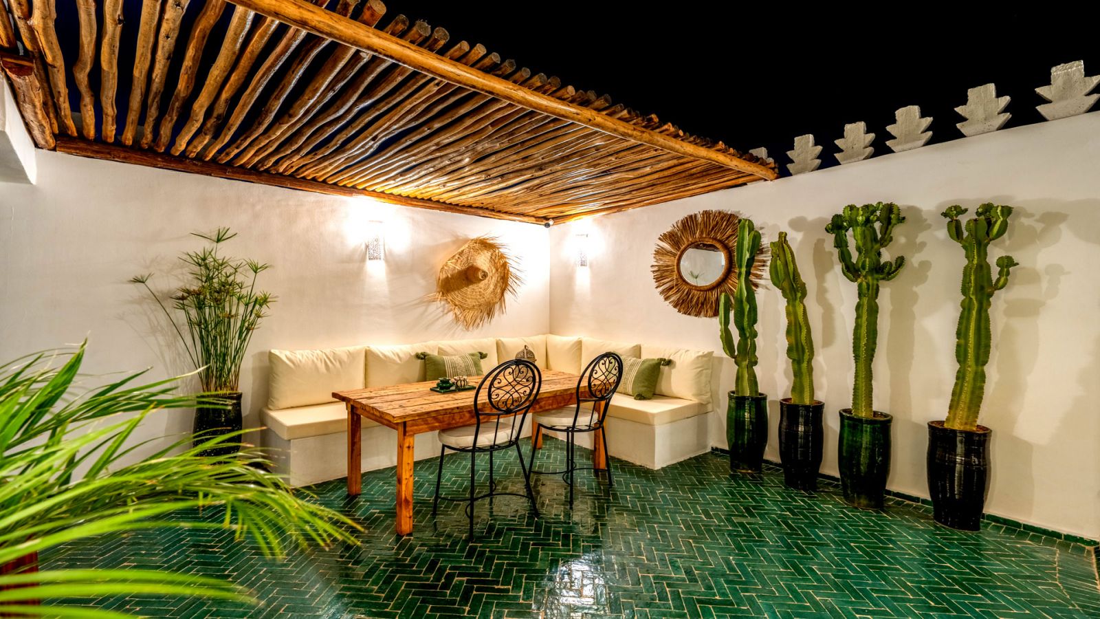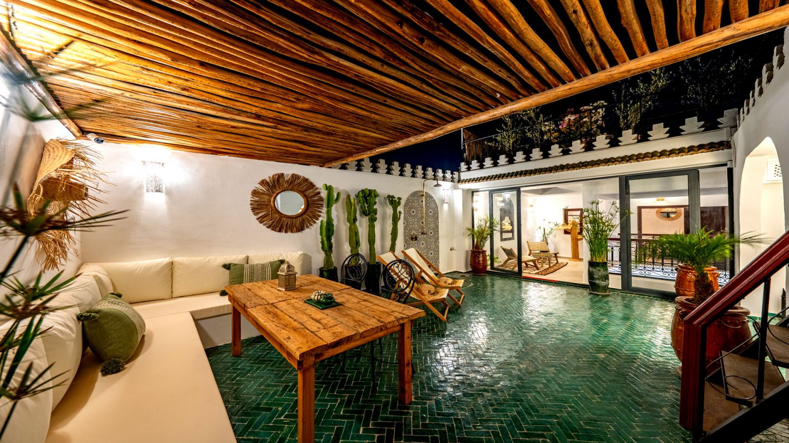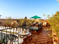 Le regard s’évade vers les minarets, les toits ocre et, au loin, les montagnes de l’Atlas. Au coucher du soleil, les lanternes s’allument, et l’endroit devient un écrin intime où savourer un thé à la menthe ou un dîner sous les étoiles.